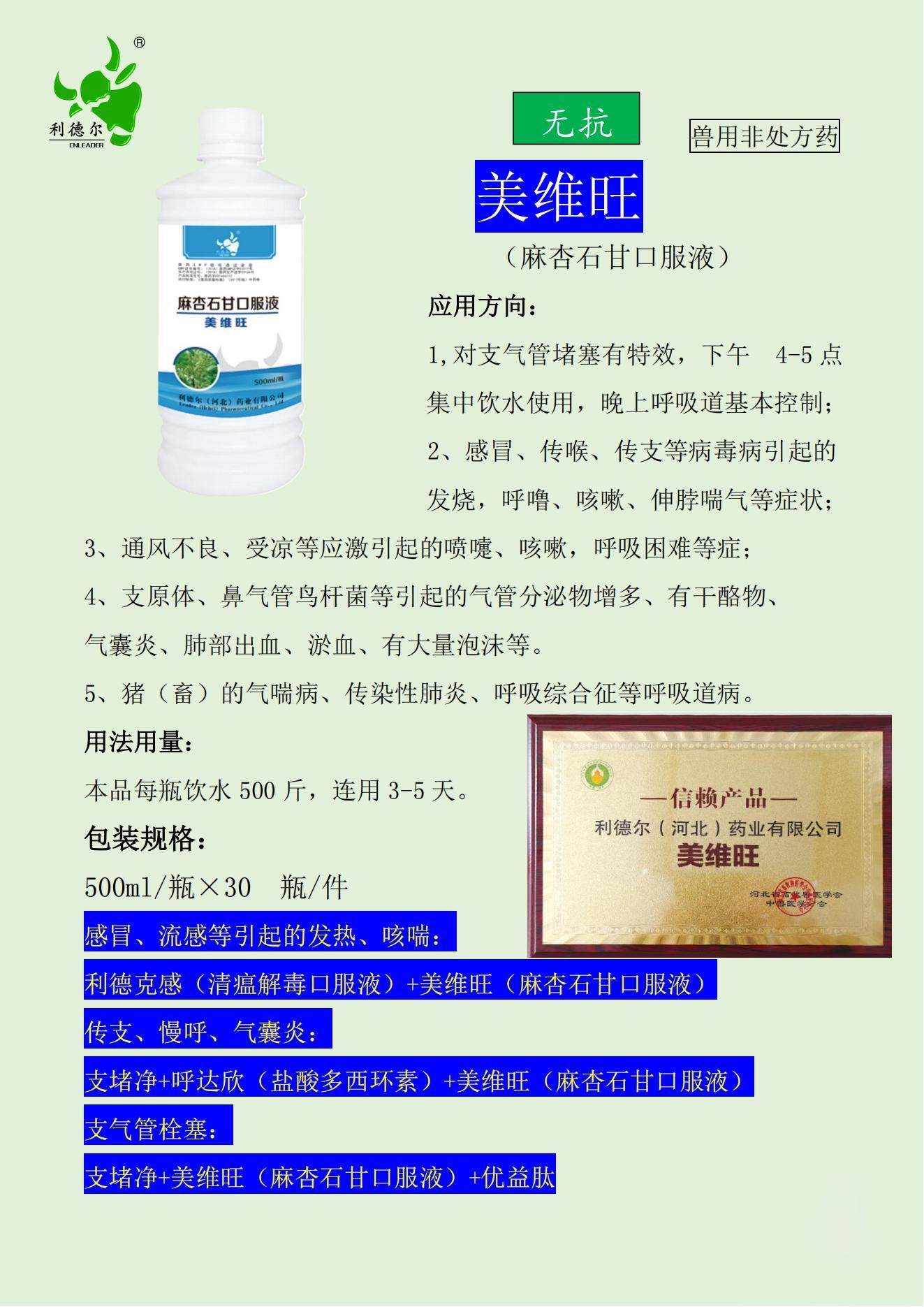 治療方案:感小潔15瓶/天,呼達(dá)欣25袋/天,美維旺15瓶/天,混合飲水,每天一次,連用5天。