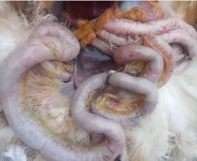 解剖癥狀:打開(kāi)腹腔一股刺鼻的味道,有部分雞的腸道會(huì)隨著打開(kāi)的腹腔及時(shí)沖到體外,腸道充氣,剪開(kāi)腸壁變薄。有的雞的腸道有一層麩皮樣附著在腸壁上,腸內(nèi)有黃色或者是肉色的內(nèi)容物,在腸道的后三分子一處有脫落的腸黏膜,盲腸有黑或者是紅色的物質(zhì)。