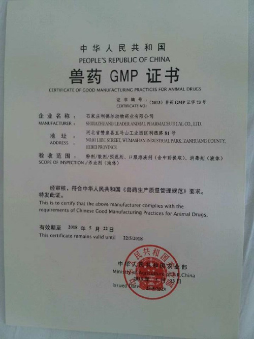 利德爾藥業(yè)有限公司新基地于2013年5月22號通過認證,公司擁有一整套達到GMP標準的生產(chǎn)設(shè)備、檢驗儀器和完善的質(zhì)量保證體系,公司擁有粉劑、散劑、預(yù)混劑、口服溶液劑(中藥提取液)、消毒劑、殺蟲劑等生產(chǎn)線,已全部通過獸藥GMP認證。