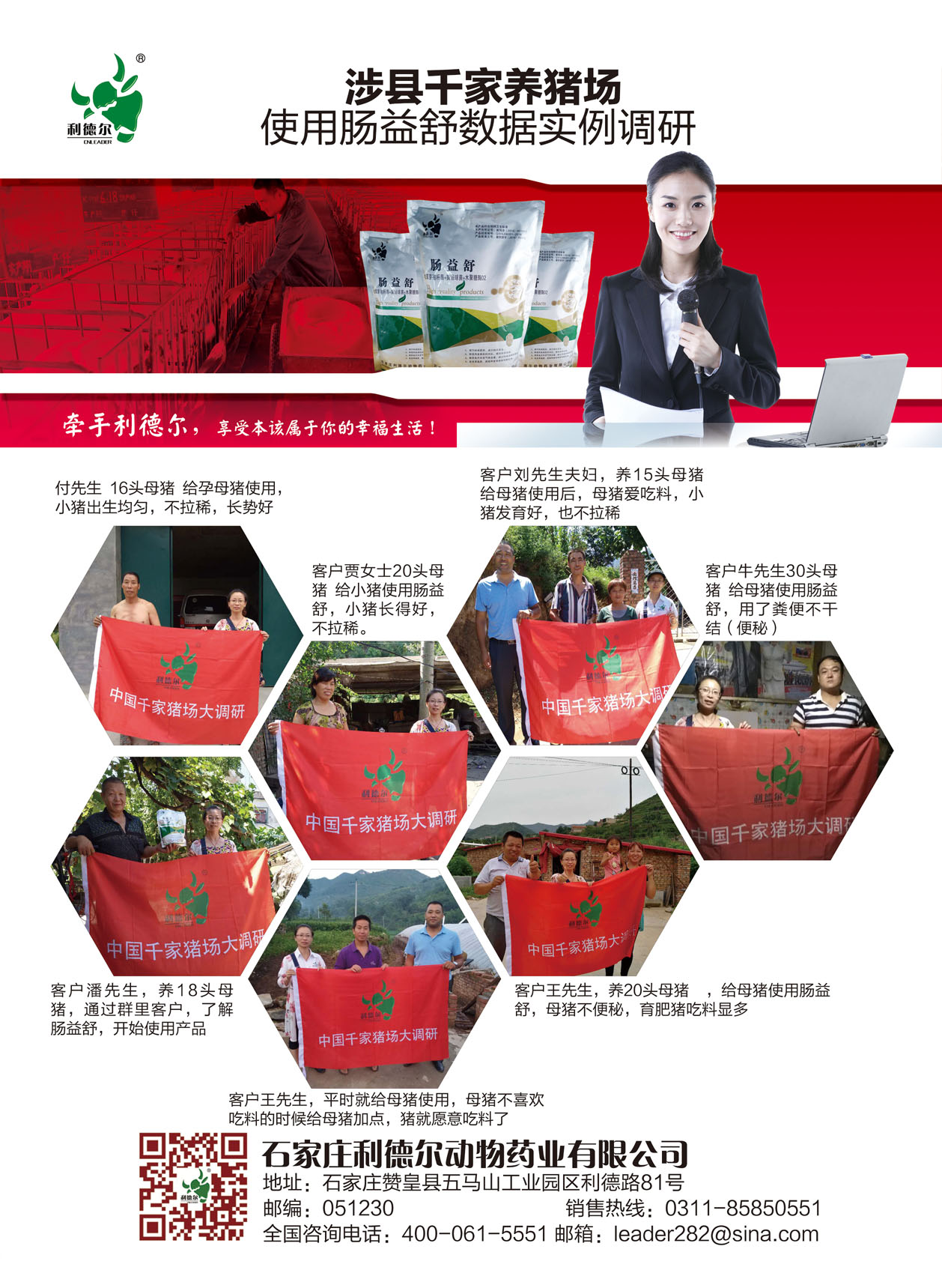 腸益舒投放市場(chǎng)將近半年時(shí)間,市場(chǎng)遍布石家莊周邊,唐山、承德,邯鄲,山東、東北,河南,廣東,福建等地,利德爾藥業(yè)本著對(duì)客戶負(fù)責(zé),對(duì)用戶負(fù)責(zé)的精神!利德爾千家豬場(chǎng)大調(diào)研正在進(jìn)行中,我們已經(jīng)走訪了承德,石家莊周邊和邯鄲部分縣區(qū),雖然今年的養(yǎng)豬行情不如去年,但是養(yǎng)豬戶還是很積極的在擴(kuò)建,怎樣把豬養(yǎng)好。通過市場(chǎng)走訪,養(yǎng)殖戶對(duì)公司的腸益舒評(píng)價(jià)非常高: