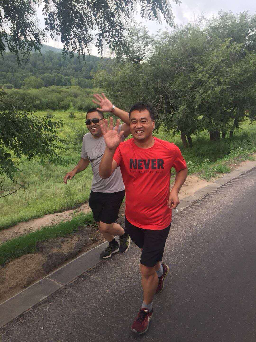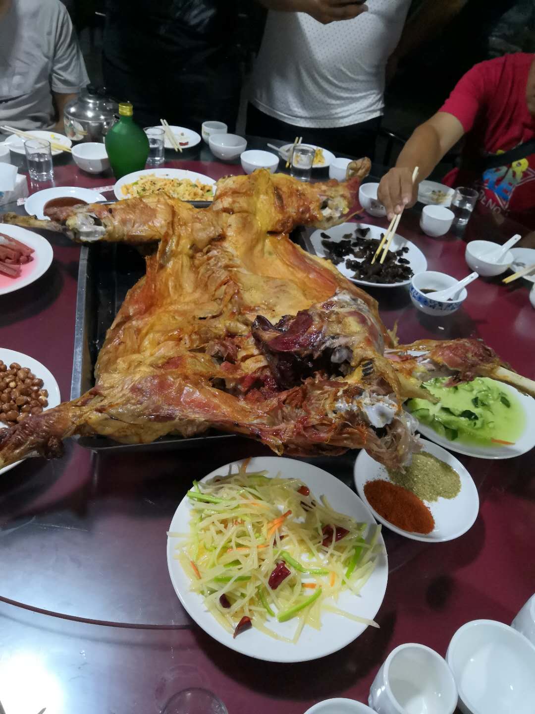 本以為已到目的地,結(jié)果還需開車?yán)@行而上,天黑,加上下雨,車速不敢太快,沿路沒有路燈,開始進(jìn)入森林地帶,真擔(dān)心,會不會從林子里跳出只“大貓”來!哈哈,開個玩笑了!大概有一個小時的行程,我們來到提前預(yù)定好的住所,香噴噴的烤全羊,已經(jīng)讓饑餓的肚子忍不住,流口水了,進(jìn)入房間放下行李,稍作收拾,直奔餐廳。十多個人圍著一張大圓桌,等待店家把全羊呈上來,羊烤的外焦里嫩,不到一個小時的時間一只60斤的羊,就剩下了骨頭架子,戰(zhàn)斗力不錯吧!由于氣候涼爽,空氣清新,飯后他們又一起跑去遛彎吸氧!呵呵,精神頭十足。
