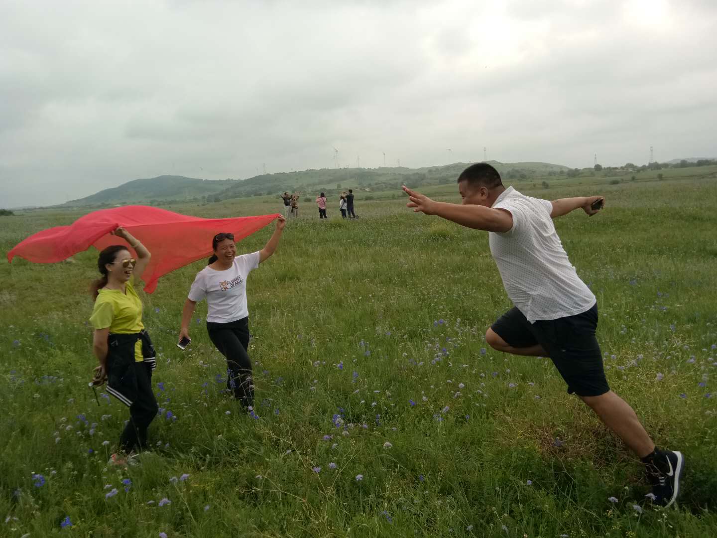 第二天,啟程直奔草原,車行駛沒有多遠(yuǎn),就看到了草原,路邊好多車,好多游客在駐足拍照留影,我們隨即停車。初入草原,瞬間被草原的草,草原的天,草原的花……被草原的一切吸引住了?上旃蛔髅,時不時的給我們來點小雨伴奏。進(jìn)入草原各種pose拍照,跳躍的,匍匐的,跑著的,感覺一切都是那么的美!