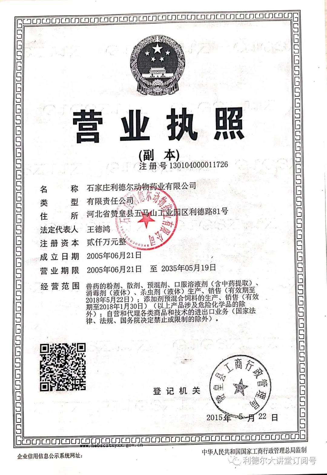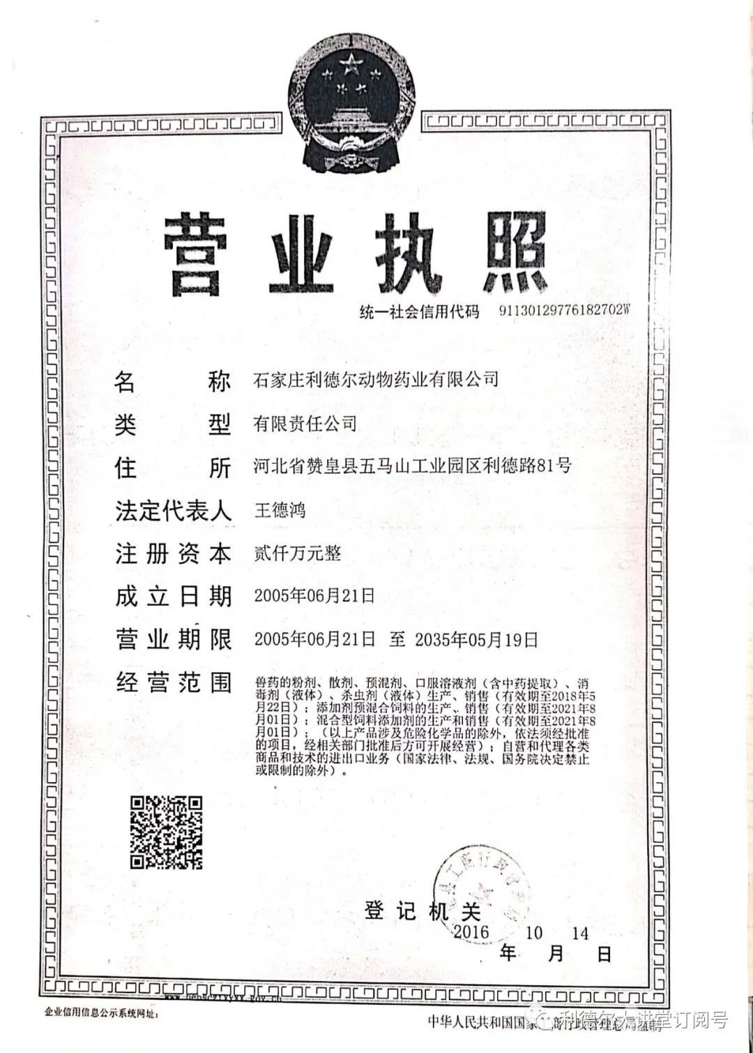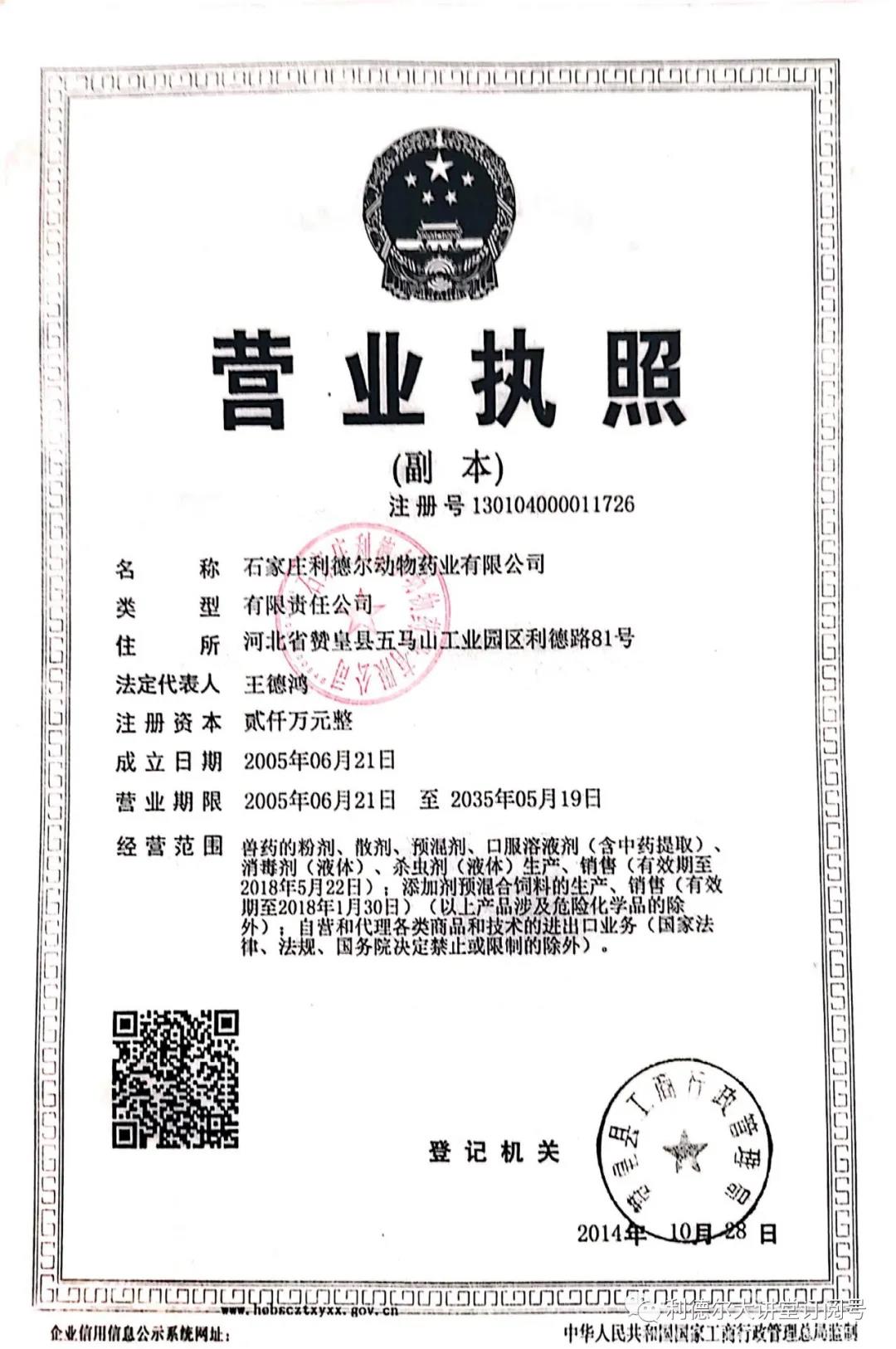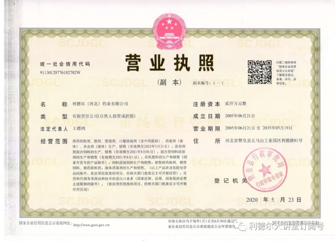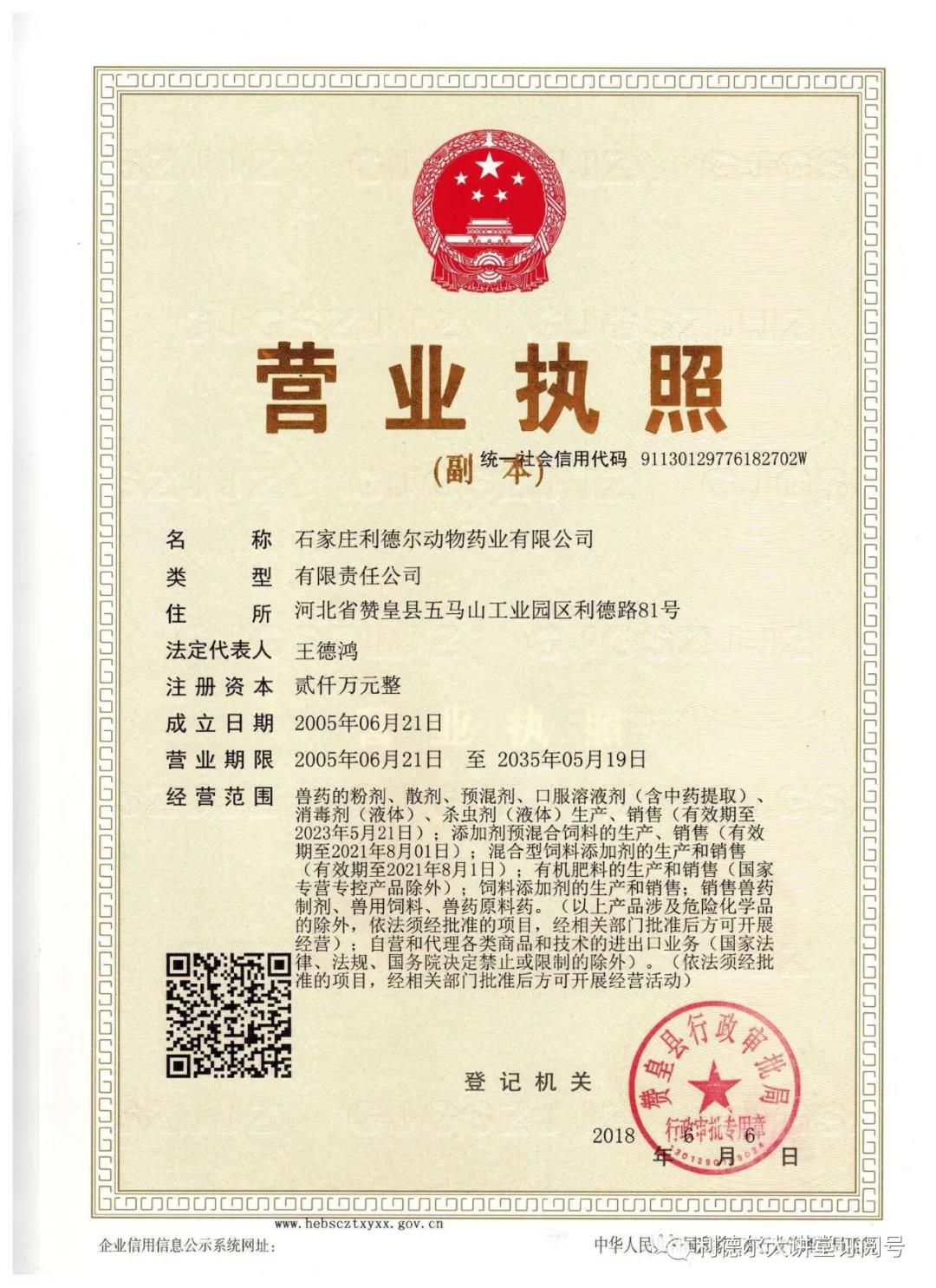 2018年度,獸藥生產(chǎn)線又一次順利通過驗收,經(jīng)營范圍再一次變更。經(jīng)營范圍增加了獸藥原料、有機肥料等項目!