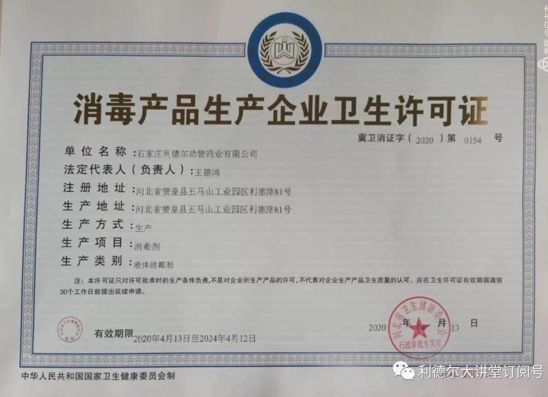 2020年度突如其來的疫情,勇?lián)?zé)任的利德爾人申請了衛(wèi)健委的消毒產(chǎn)品的經(jīng)營許可,用于生產(chǎn)人民所急需的消毒產(chǎn)品。經(jīng)營范圍再一次擴充。